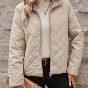 Solid color long-sleeved collared diamond quilted elegant loose-fitting women’s warm coat