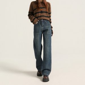 Women’s winter fleece-lined jeans with elastic waist, retro wide-leg design, and side embroidery