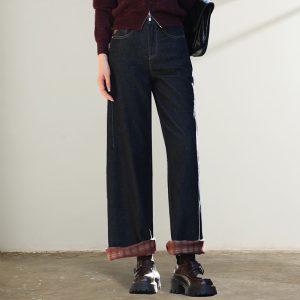 Women’s winter red plaid fleece wide-leg jeans, colorfast dark blue denim