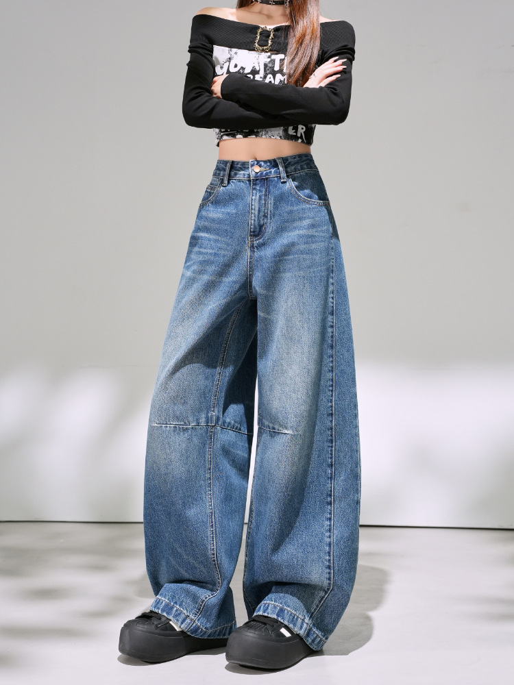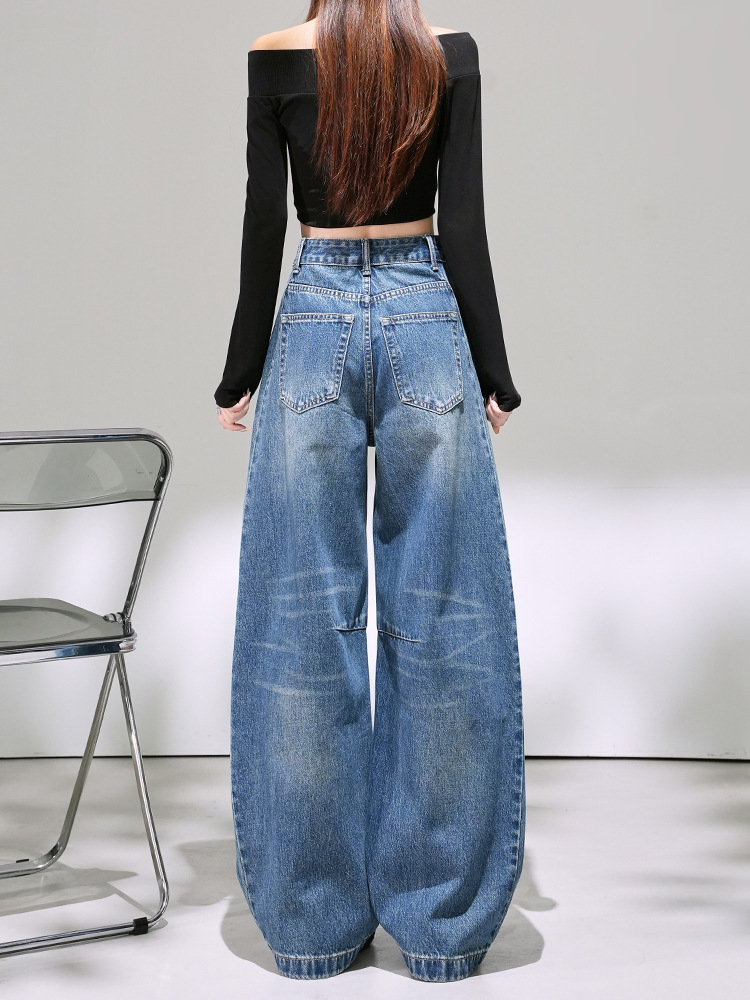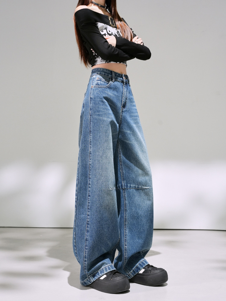 Retro blue straight-leg curved jeans for women