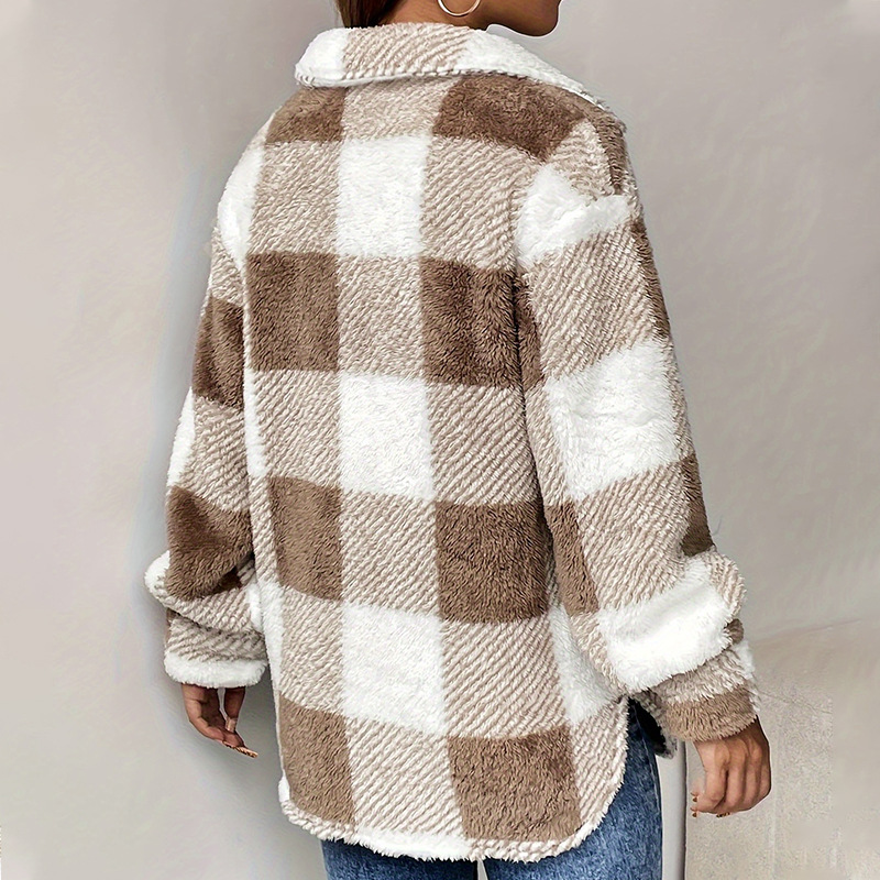 Women’s Brown and White Checkered Faux Lambswool Collar Coat